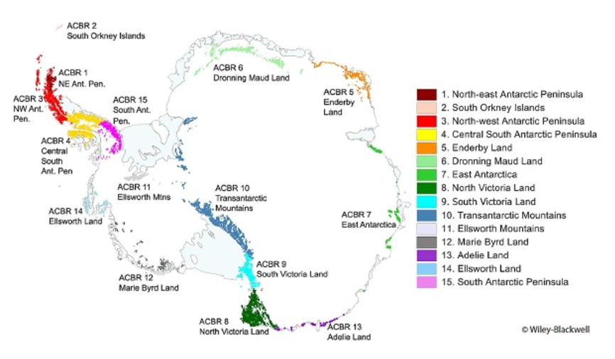 根据澳大利亚南极署(Australian Antarctic Division)2012年发布的生物地理学研究成果,南极洲各岛屿及南极大陆海岸区域被划分为15个不同分区。该报告基于对南极洲和南极周边地区无冰区地理、地质、气候、动植物群的研究,将南极复杂的生态系统从生物学角度划分了不同类型的生物地理保护区。这15个分区分别是: